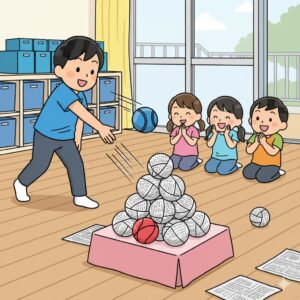 ②子どもは言われた数字のマスにジャンプし、カードで指定されたポーズで着地する。